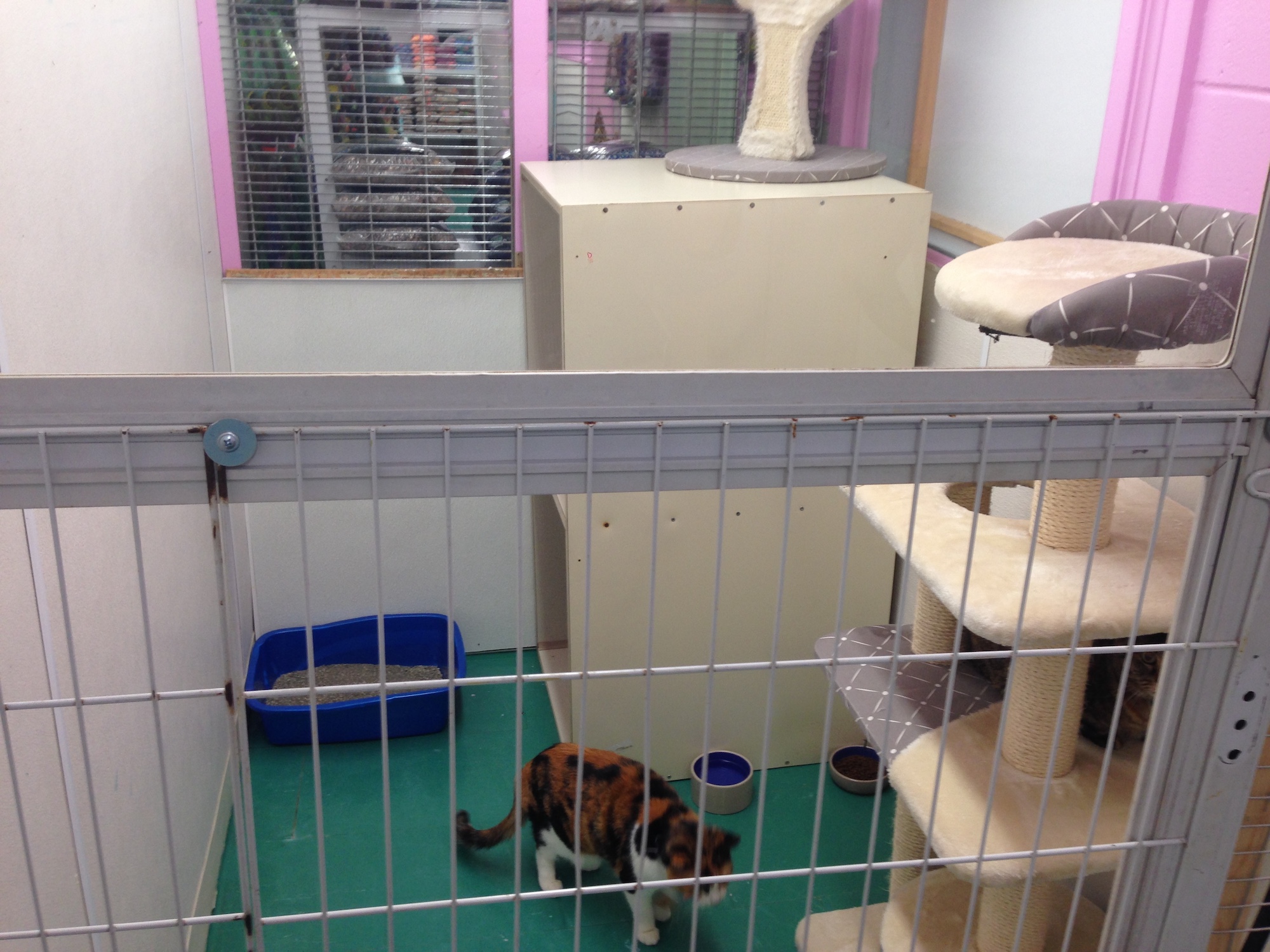 - B. Cat Condo Cages 2’ by 3’ by 4’tall with 2 resting shelves (1 with sherpa covering), litter box, ceramic food and water dishes, and partial cage cover to reduce guest stress. Single adult occupancy or multiple kittens depending on age