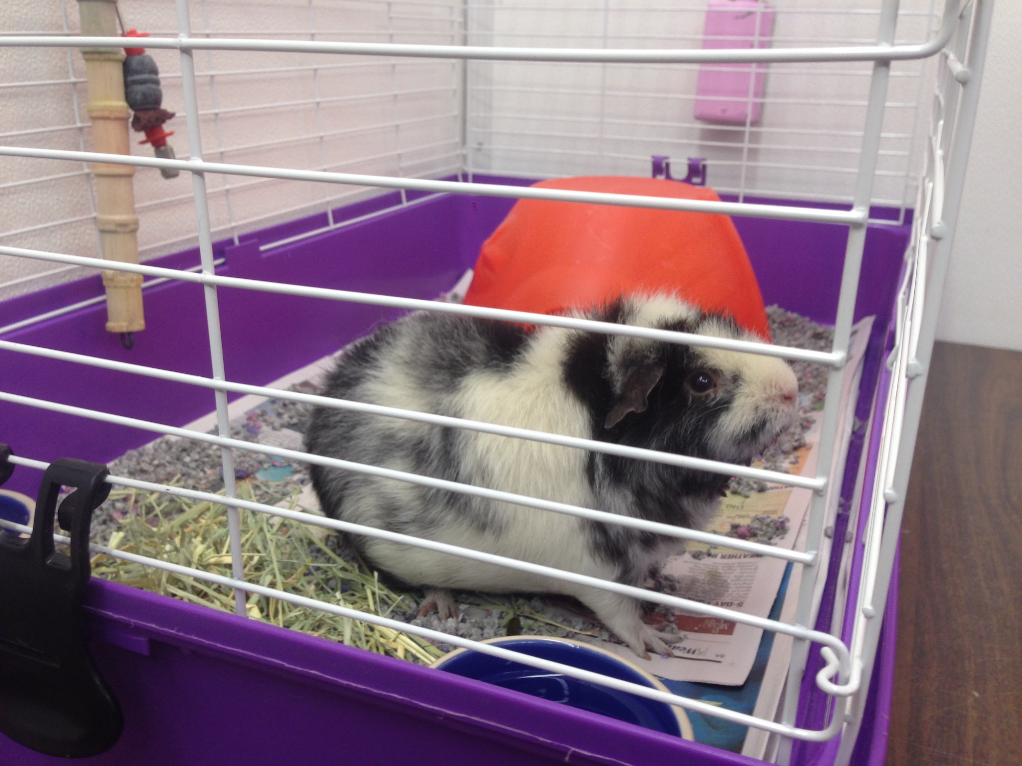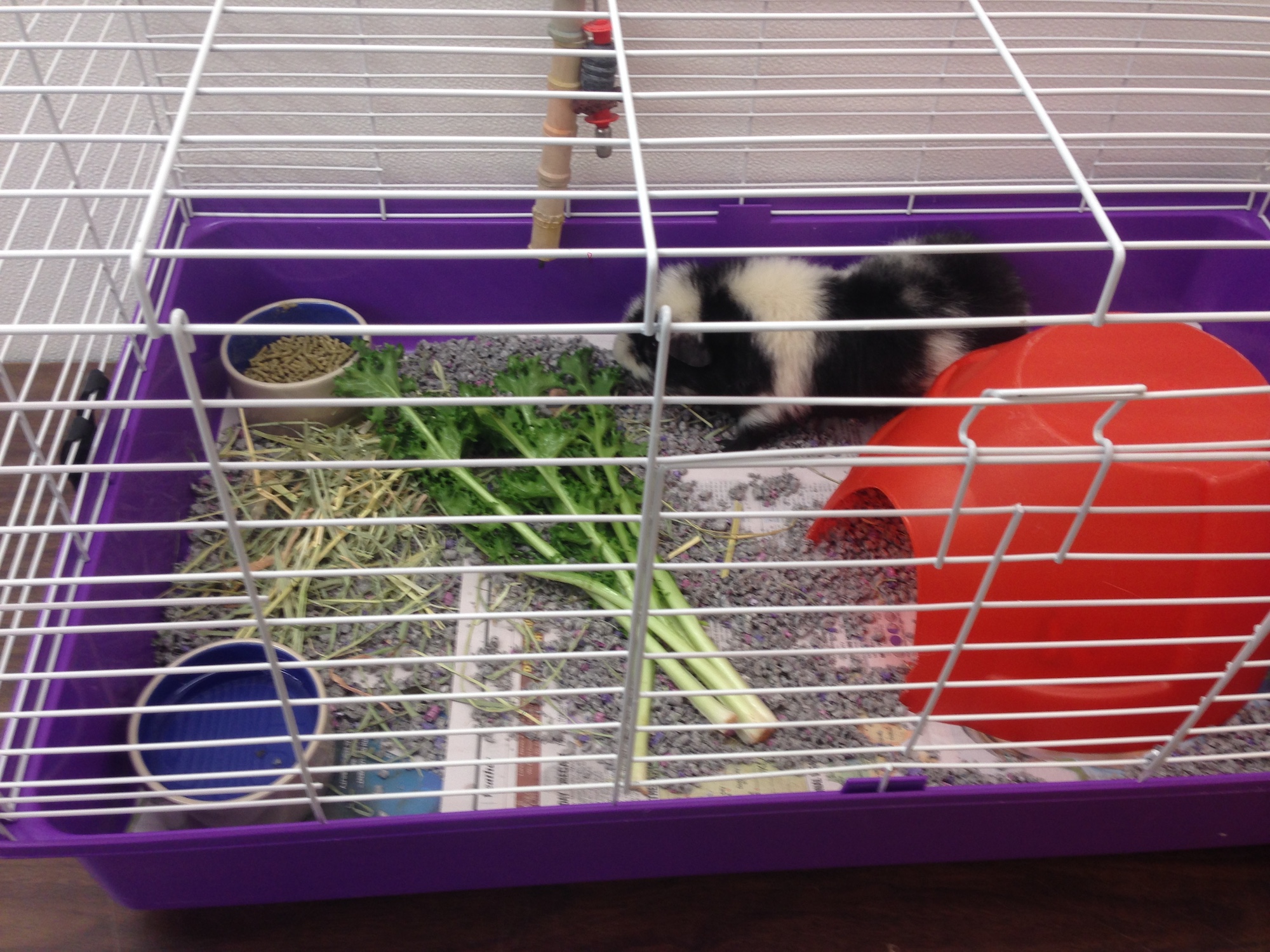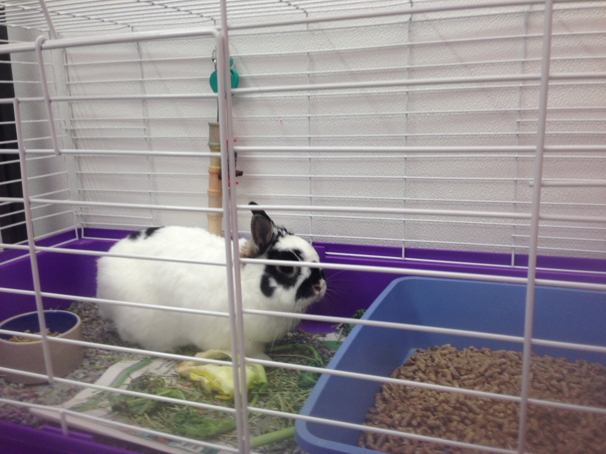 - B. 30” Wire cage with solid bottom lined with paper and bedding with ceramic food and water dishes, timothy hay, Sunseed or Oxbow pellets, fresh veggies, and chew toys. Single rabbit occupancy only. Cage is completely cleaned daily